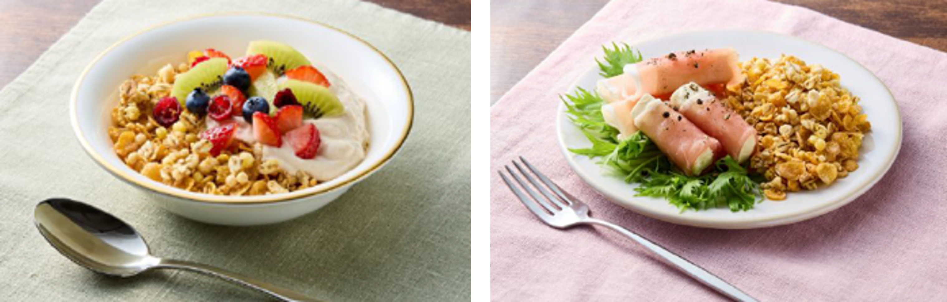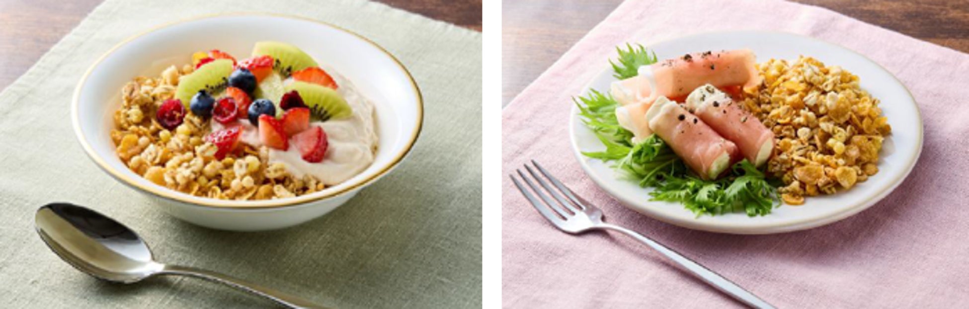 本商品は、フレークが含まれていることで食感にバリエーションがあり、生フルーツとの相性がよいほか、脂質70%オフ*¹で油が少なく甘みもあるため、塩味がある食材との相性にも優れています。