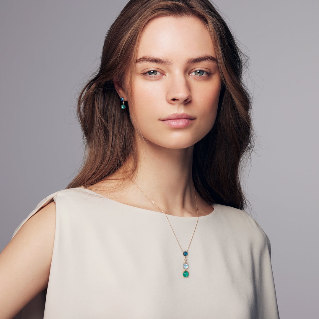 (上写真)ネックレス¥187,000 ピアス¥148,500(2点ともにK18YG/グリーンカルセドニー/ブルートパーズ/シェル/ダイヤモンド)