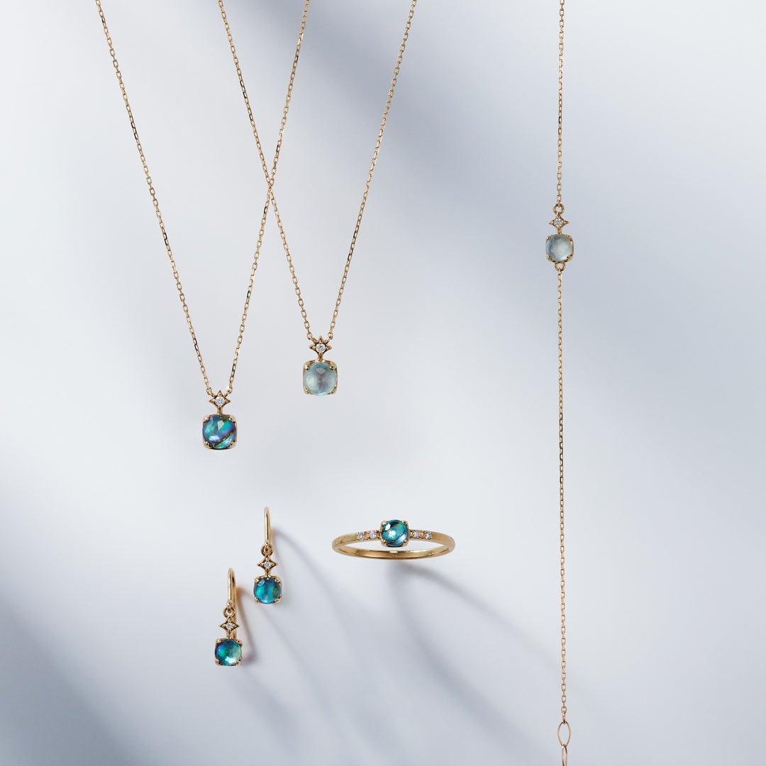 (下写真)ピアス¥57,200(K10YG/アバロンシェル/ブルートパーズ/ダイヤモンド) ネックレス左から¥47,300(K10YG/アバロンシェル/ブルートパーズ/ダイヤモンド) ¥44,000(K10YG/シェル/ブルートパーズ/ダイヤモンド) リング¥57,200(K10YG/アバロンシェル/ブルートパーズ/ダイヤモンド) ブレスレット¥36,300(K10YG/シェル/ブルートパーズ/ダイヤモンド)