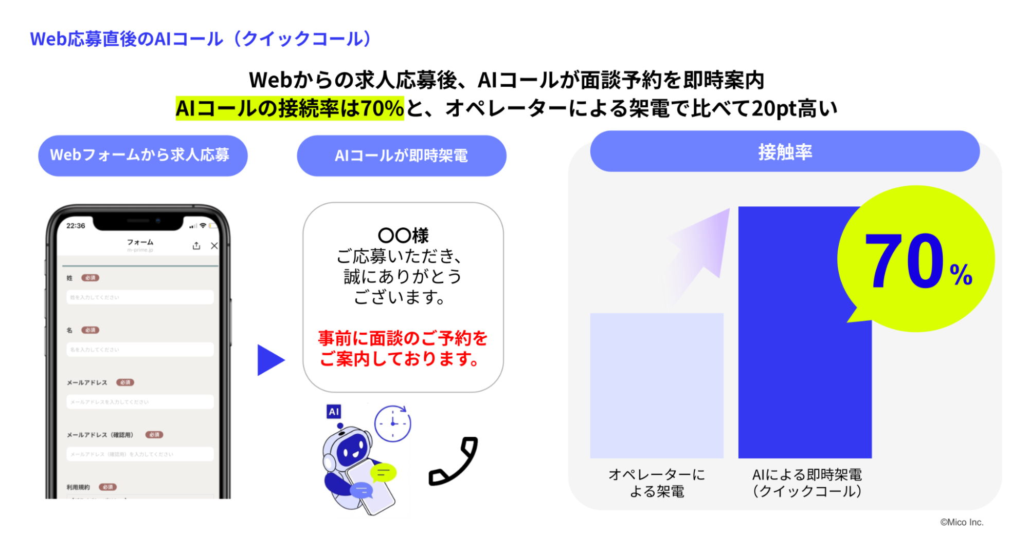 AIコール「Mico Voice AI」を用いて、求職者からのWebフォーム経由の応募直後に、AIによる即時架電(クイックコール)を行い、面談の日程調整を即座に実施しています。AIの即時架電による接触率70%を達成し、面談数増加につながっています。求職者の意欲が最も高いタイミングを逃さず、面談をご案内することでスピーディーな選考プロセスへの移行を実現しています。