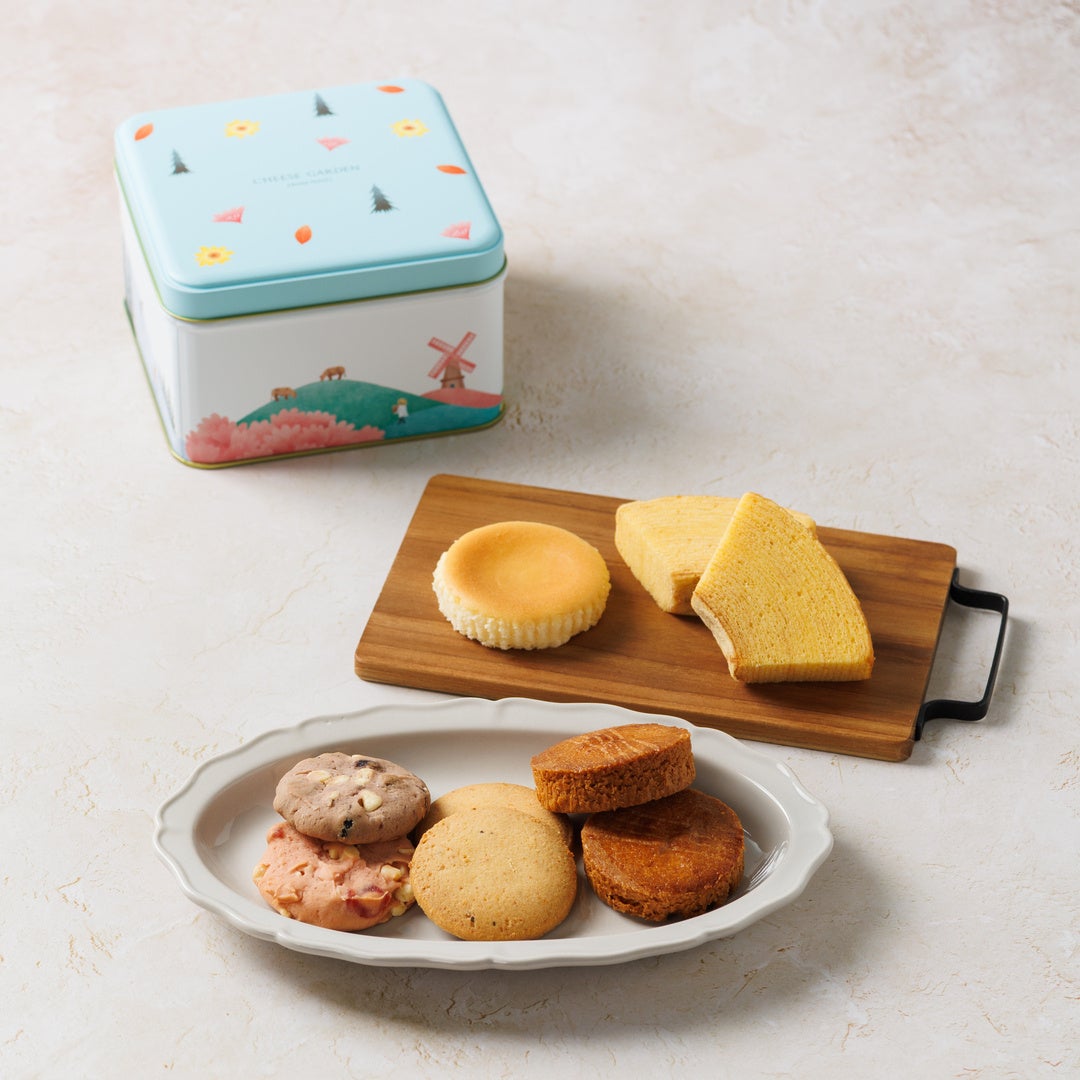 チーズガーデンの季節限定および自慢の焼菓子を少しずつ一度にお楽しみいただける、この時期だけの限定セットです。レモンの爽やかな味わいとサクサク食感が楽しめる季節限定商品「御用邸レモンチーズクッキー」や、良質なバターを使用してザクザクと食べ応えのあるよう厚めに焼き上げた「ガレットチーズ」、たっぷりの焦がしバターとハチミツを使用してふっくらと焼き上げた「フィナンシェ」、濃厚なチーズが香るしっとりとした美味しさの「チーズバウム(カット)」の全4種類のスイーツがお楽しみいただける贅沢なセットです。