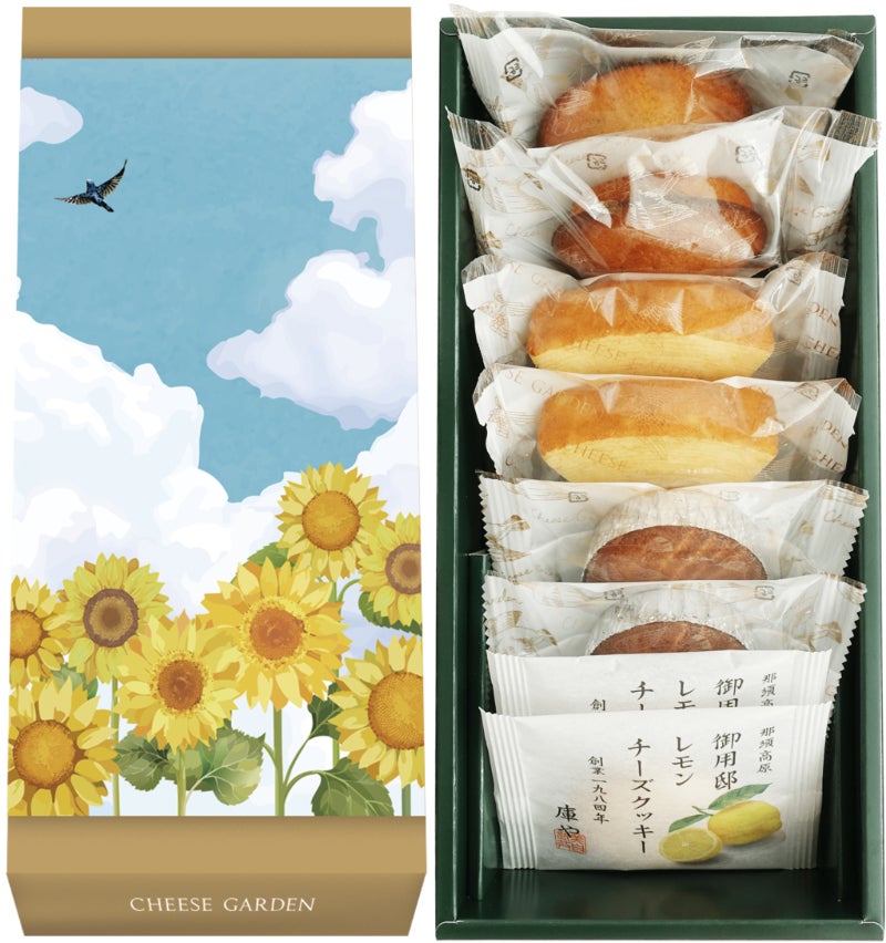 日頃の感謝や帰省の挨拶に「ありがとう」、「いかがお過ごしですか」などの想いと共に渡すのにぴったりな焼菓子セットです。夏のシンボルのひとつである「ヒマワリ」、青空に広がる「入道雲」、チーズガーデンのシンボルマークの鳥でもある、夏鳥「オオルリ」が描かれた日本の夏を愛でる限定パッケージです。
