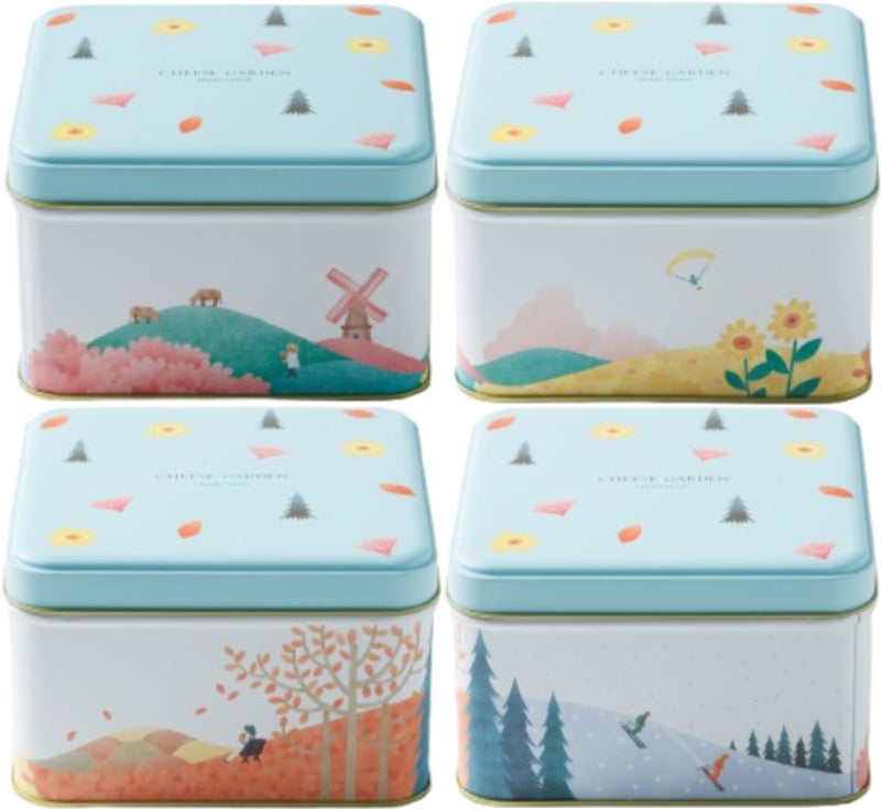 那須の春夏秋冬の自然やアクティビティが描かれたイラスト缶は、那須旅行のお土産やプレゼントにもぴったりです。こちらのイラストは、栃木県内のチーズガーデン一部店舗にて取り扱いしているオリジナル掛け紙のイラストなどを描いている、イラストレーターの熊谷奈保子さんの描き下ろしイラストです。