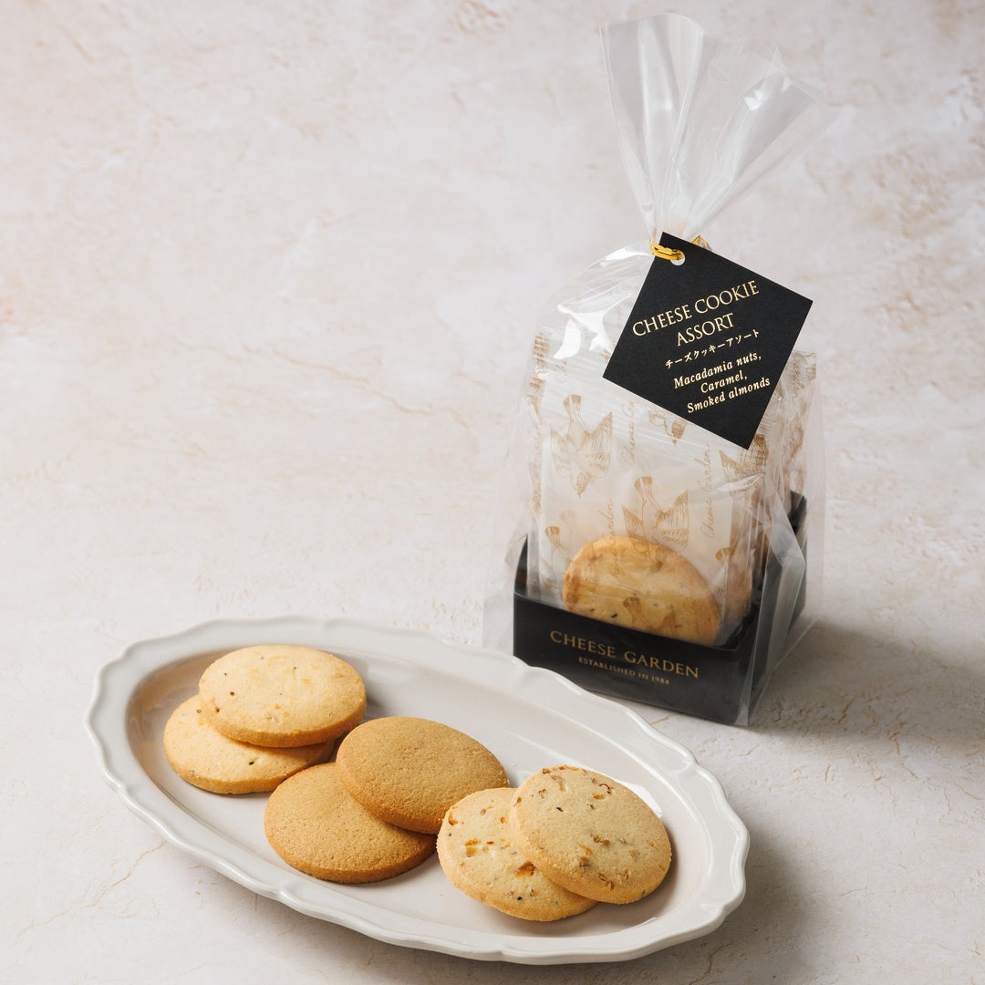 「マカダミアナッツ」「キャラメル」「スモークアーモンド」の3フレーバーのクッキーを各2枚詰め合わせた、チーズガーデンが提案する新しいチーズクッキーです。チーズのコクや塩味と、各素材が引き出す香りや風味、食感をお楽しみいただけます。