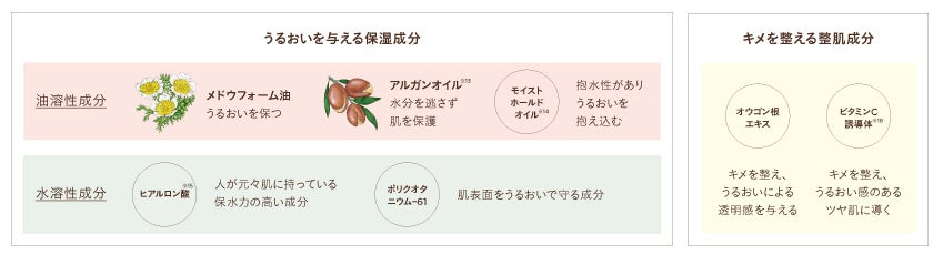 ※1 メイクがのりにく乾燥した肌の状態 ※2 エモリエント剤 ※3 エモリエント剤:スクレロカリアビレア種子油 ※4 エモリエント剤:アルガニアスピノサ核油 ※5 ヒドロキシアパタイト ※6 マイカ ※7 ラウロイルリシン