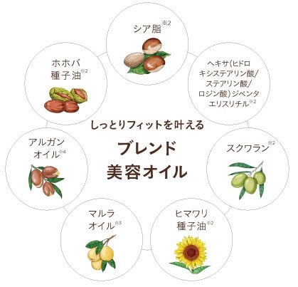 うるおいを抱え込むオイルやうるおいを閉じ込めるオイルなど、固形から液状までさまざまな性状のオイルをバランスよくブレンド。