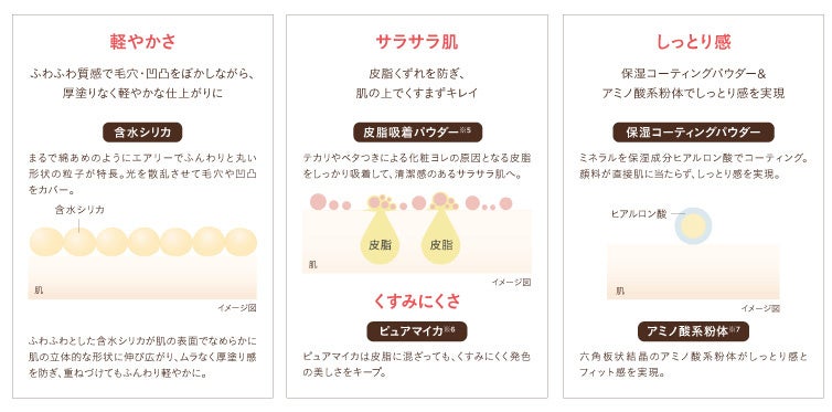 鏡のように光を反射して透明感※12を演出する「マイカ」と、光を散乱させて凹凸をぼかす「シリカ」を配合。2種類のパウダーを掛け合わせることで、光の効果で素肌を生かした自然でなめらかな仕上がりを叶えます。