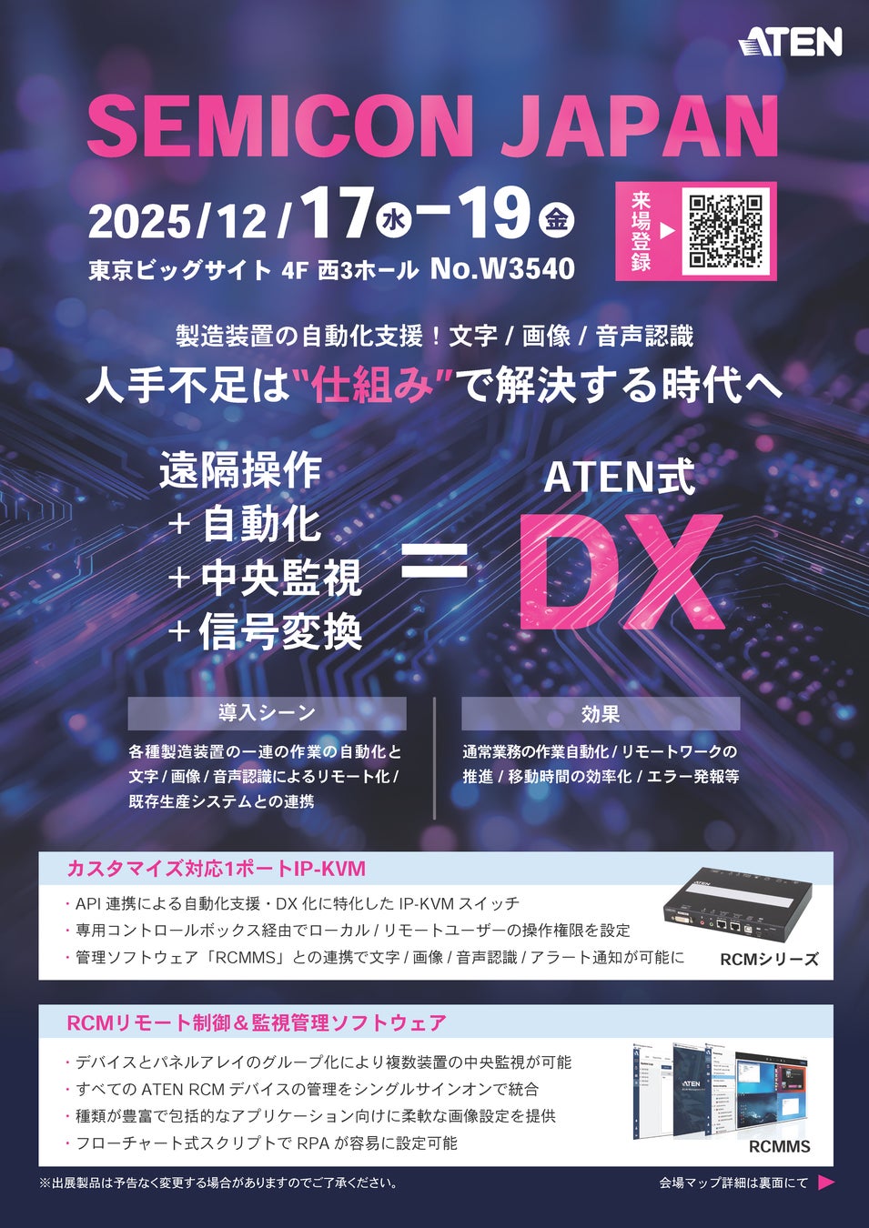 KVMおよびAV/IT接続・管理ソリューションのリーディングプロバイダーであるATENジャパン株式会社(取締役社長:鄧 鴻群[Hans Teng])は、2025年12月17日(水)~19日(金)に東京ビッグサイトで開催される「SEMICON Japan 2025」に出展いたします。