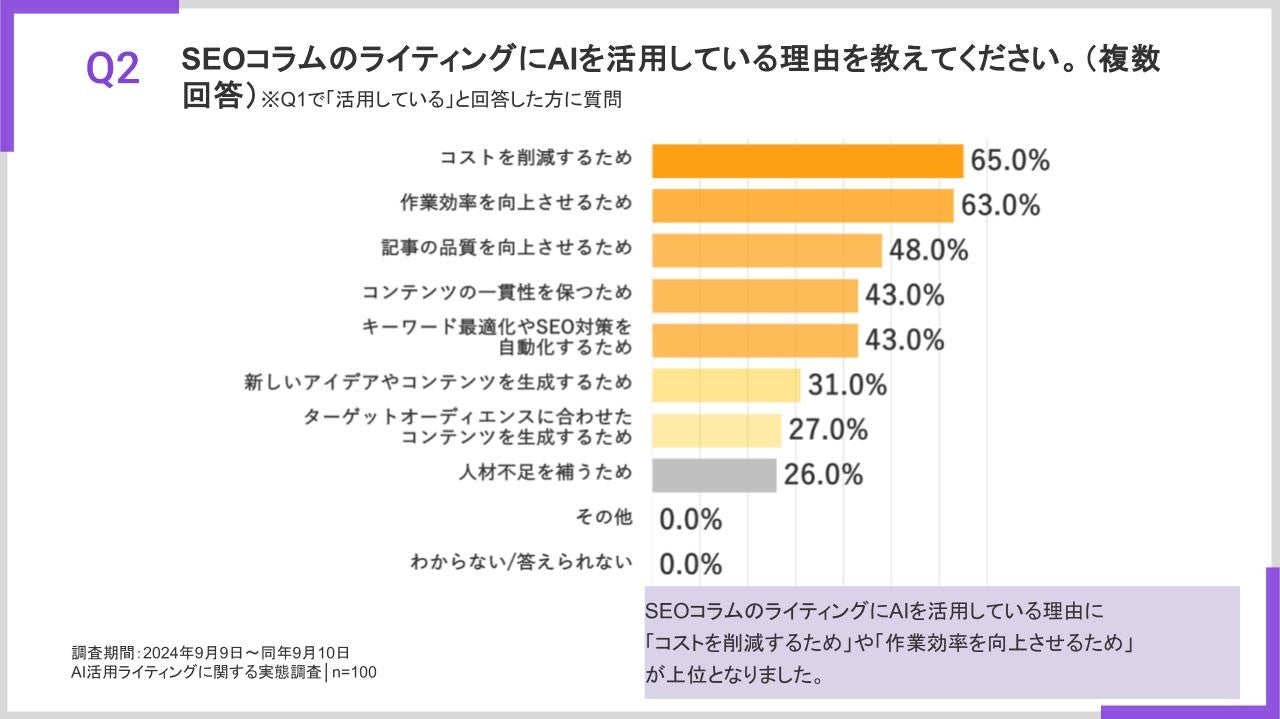 Q1で「活用している」と回答した方に、「SEOコラムのライティングにAIを活用している理由を教えてください。」(n-100、複数回答)と質問したところ以下の結果になりました。