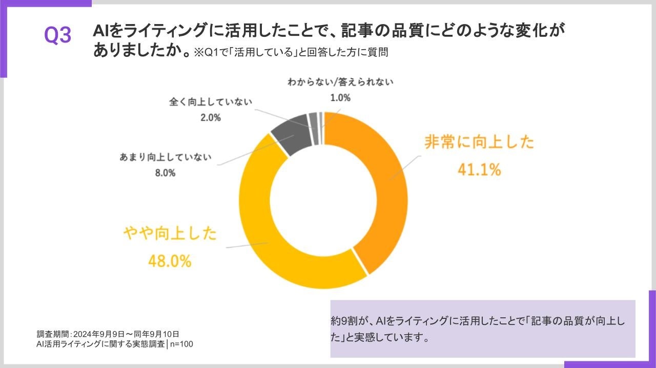 約9割が、AIをライティングに活用したことで「記事の品質が向上した」と実感している