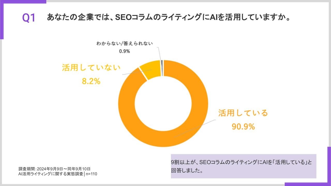 9割以上がSEOのライティングに「AI」を活用!うち約9割が「記事の質が向上した」と評価。勤務先での「ライターの活用が減少した」という回答は7割以上。