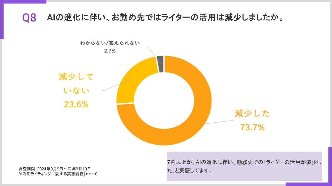「AIの進化に伴い、お勤め先ではライターの活用は減少しましたか。」(n=110)という質問に対しては、「減少した」が73.7%、「減少していない」が23.6%、「わからない/答えられない」が2.7%という結果になりました。