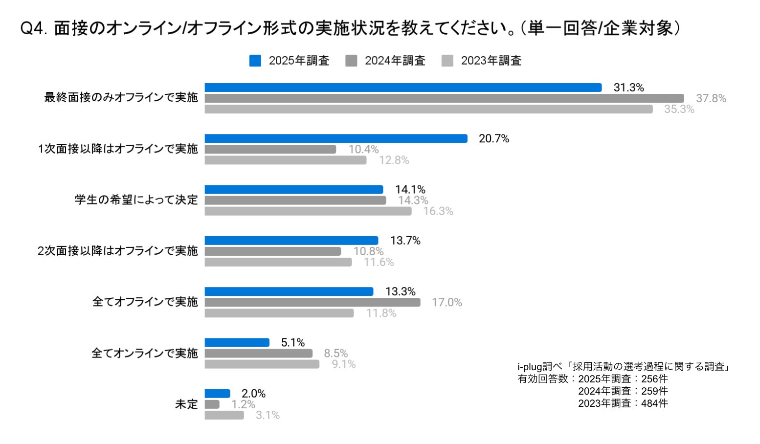 企業を対象に実施した「面接のオンライン/オフライン形式の実施状況」に関する設問では、「最終面接のみオフラインで実施」と回答した企業が、最多の31.3%と、昨年度の調査結果(37.8%)から、6.5ポイント減少しました。上記の設問で、26卒学生も「最終面接のみ対面を希望」の回答が最多であったことから、双方のニーズが一致していることがわかります。