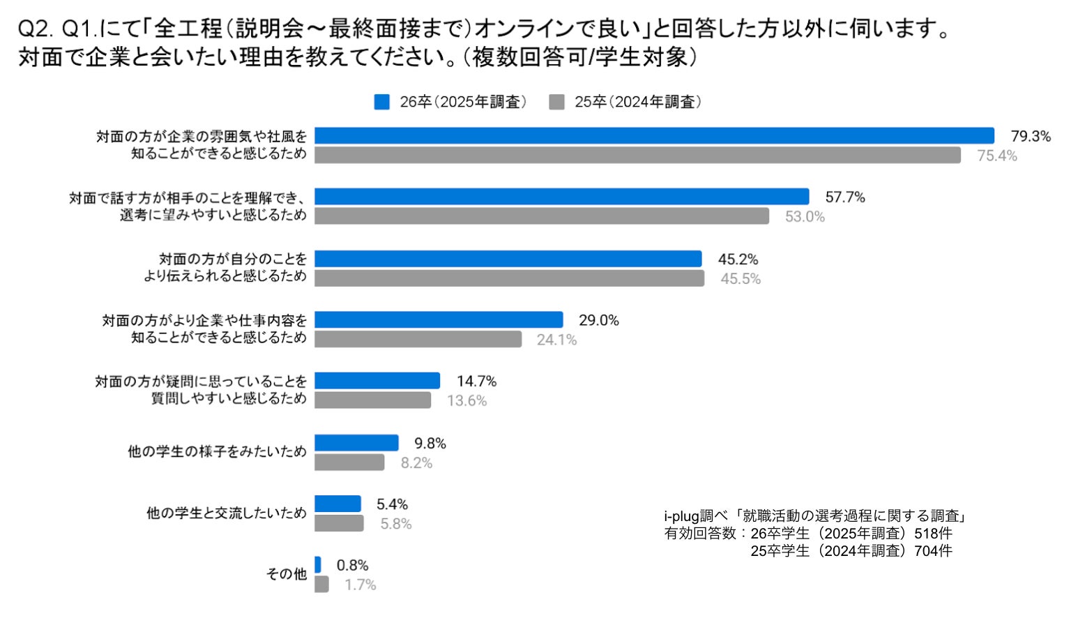 Q2. Q1.にて「全工程(説明会〜最終面接まで)オンラインで良い」と回答した方以外に伺います。対面で企業と会いたい理由を教えてください。(複数回答可/学生対象)
