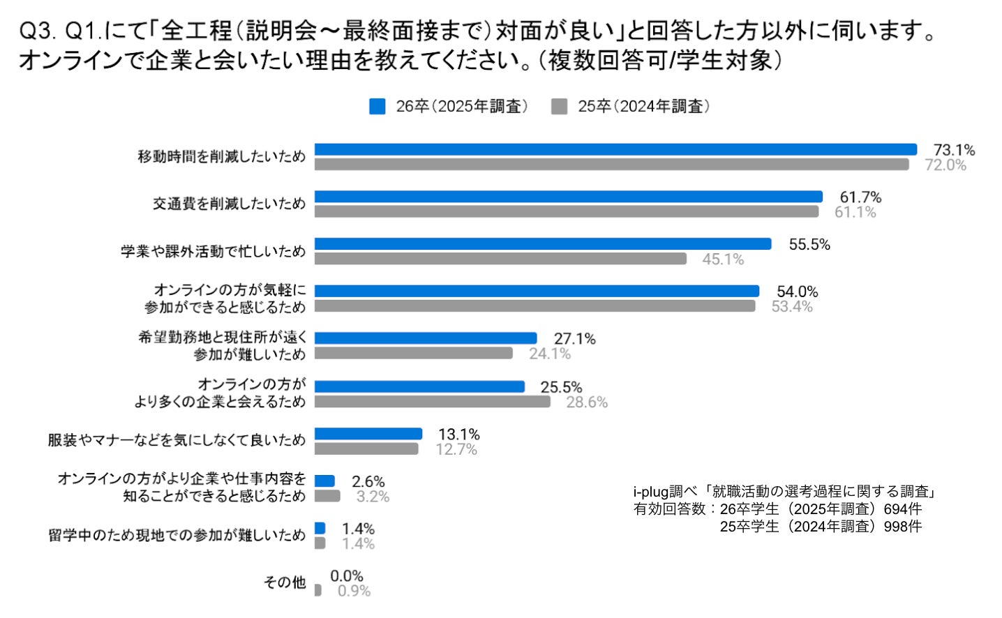 「移動時間を削減したいため」が最多の73.1%でした。また、「学業や課外活動で忙しいため」と回答した学生が55.5%と、昨年の25卒学生の結果から10.4ポイント増加しました。