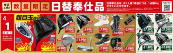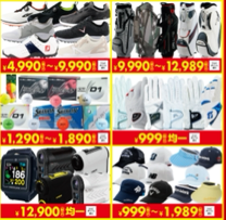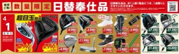 3日間合計48品目の数量限定日替わり奉仕品をご用意いたしました。超目玉商品としてピン・タイトリスト・テーラーメイドの人気ドライバーを9,900円で連日販売いたします。他にもアイアンセット、フェアウェイウッド・ユーティリティー・パター・ゴルフシューズ・中古クラブ等々びっくり価格の日替わり奉仕品をずらりとご用意いたしました。日替わり奉仕品以外にもお買い得品満載!! 人気ブランドのシャツ・ボトムス・シューズ・キャディーバッグ・ボール・グローブ・キャップに至るまで均一価格で大放出!! JLPGAツアーでも使用が解禁された距離計測器も均一価格でズラリ勢ぞろい!!さらに3,000本以上の在庫がある中古クラブを全品対象で10%OFFや今が旬のアパレルも対象商品が10%OFFなど充実の企画もご用意しております。このチャンスをお見逃しなく!!!