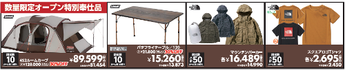 アルペンアウトドアーズが都内初登場!人気アイテムをオープンならではの驚きの価格でご用意しました。日替わり数量限定奉仕品は厳選された今すぐ欲しい商品ばかりが過去のアルペンアウトドアーズのオープンでは例を見ない3日間合計32品目。さらに数量限定オープン特別奉仕品としてコールマンの人気のテントやテーブルがなんと30%OFF!中々入手できないDODのカマボコテント、ペトロマックスやヴェイパラックスのランタンなどのレアアイテムも新宿店ならではのスケール感で取り揃えました!