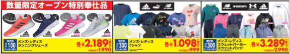 新宿店オープン特別奉仕品が大集合!3日間の数量限定日替わり奉仕品はなんと合計108品目!「あの人気商品がホントにこの価格?!」の衝撃価格のオンパレードで、商品の「質」「量」共にスポーツデポ史上 かつてない規模でご用意いたしました。特に新宿店の強みである「ランニング」「バスケットボール」「フットボール」「ベースボール」の各アイテムは大注目です。