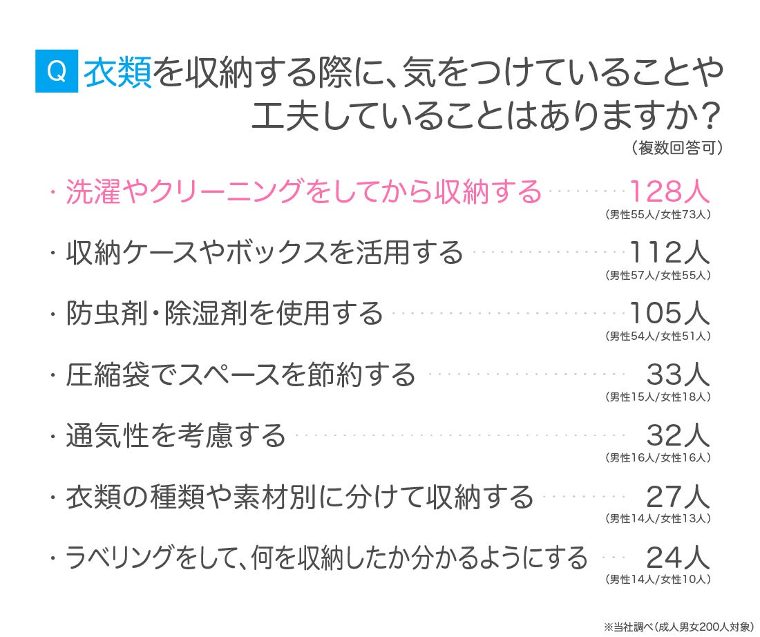 アンケートの結果、洗濯やクリーニングをしてから収納する人が多いことがわかりました。