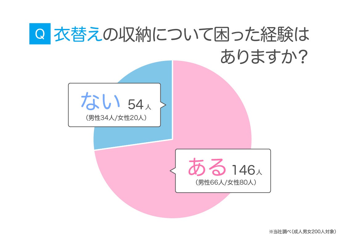 成人男女200人を対象に「衣替えの収納について困った経験はありますか?」と聞いたところ、146人が「ある」と回答しました。