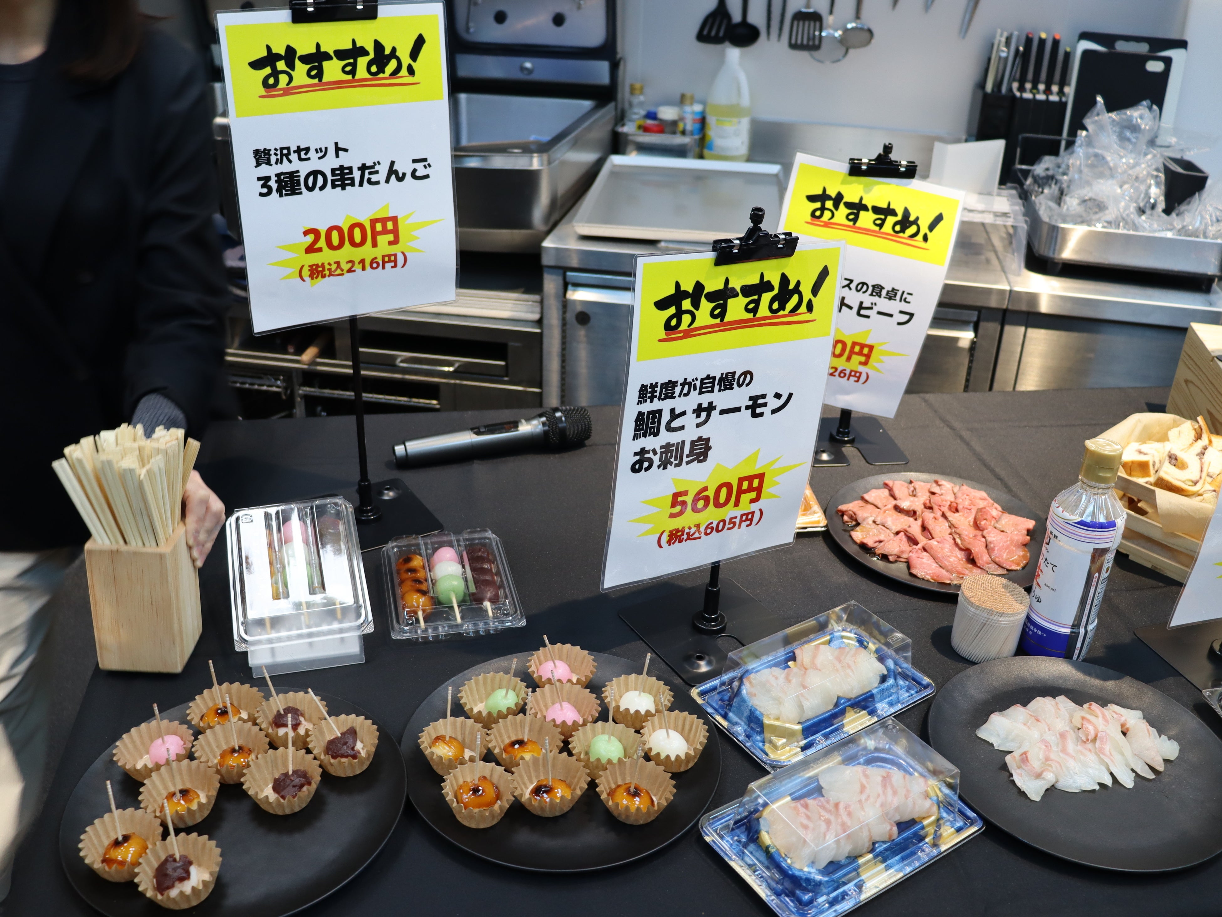 セミナー後半では、会場参加者向けに試食会を実施。刺身、ローストビーフ、かぼちゃの煮物、パン、団子といった惣菜・スイーツを、一度冷凍・保管したものを解凍して提供し、スーパーの惣菜売場を再現しました。