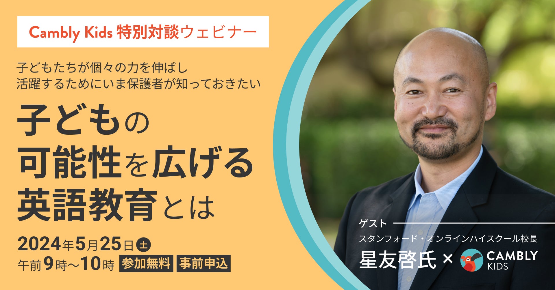 「CAMBLY KIDS(キャンブリーキッズ)」は、第二言語習得理論に基づく学習手法を取り入れた独自カリキュラムを使い、ネイティブ講師と実践的な英会話を学ぶことができる、子ども向けのサービスです。CAMBLY KIDSを利用・検討する保護者からよく寄せられる、英語への取り組み方への質問に、星友啓先生とCamblyの社員が対談形式で答え、子どもたちの未来につながる英語教育のあり方と家庭で実践できる効果的な学習法について理解を深めることができます。