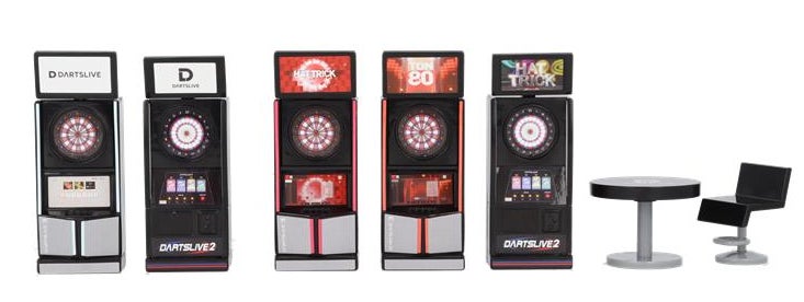 本商品はオンラインダーツマシンで国内No.1の設置台数を誇る「ダーツライブ」シリーズをミニチュア化。全6種のうち3種はリアルなダーツサウンドを搭載しています。ロゴがデザインされたテーブル&チェアセットと組み合わせれば、スタイリッシュなミニチュアダーツバーが完成します。