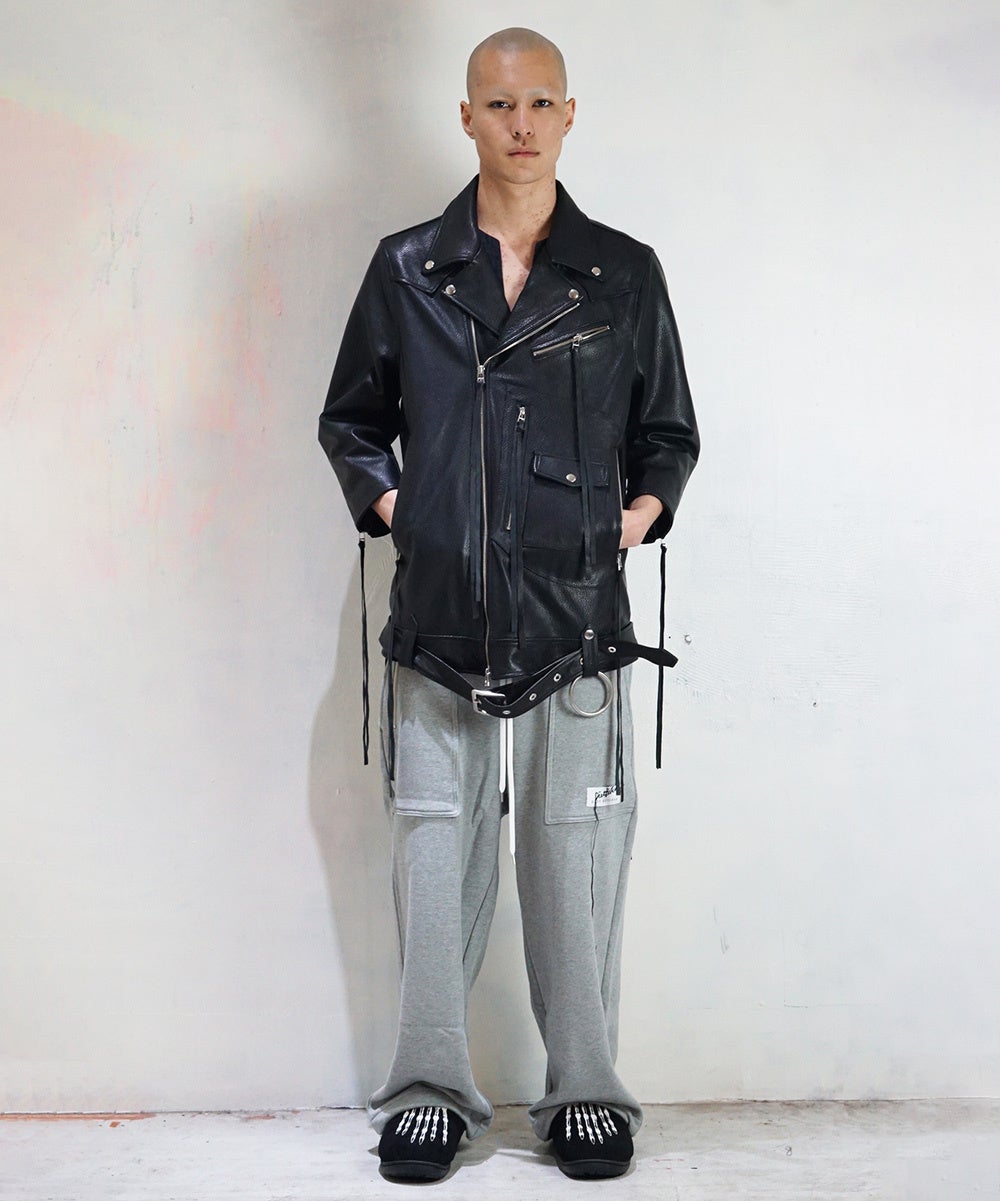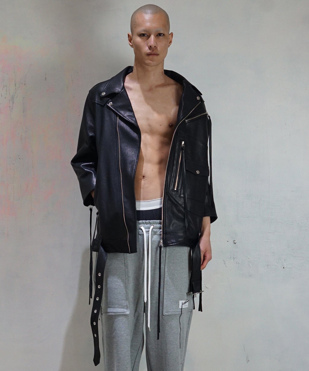 全体としてはオーバーサイズのシルエットでありながら、DIET BUTCHERアーカイブの名作「七分袖ライダース」から袖丈を踏襲したことで、ルーズ過ぎずスタイリッシュな印象に。