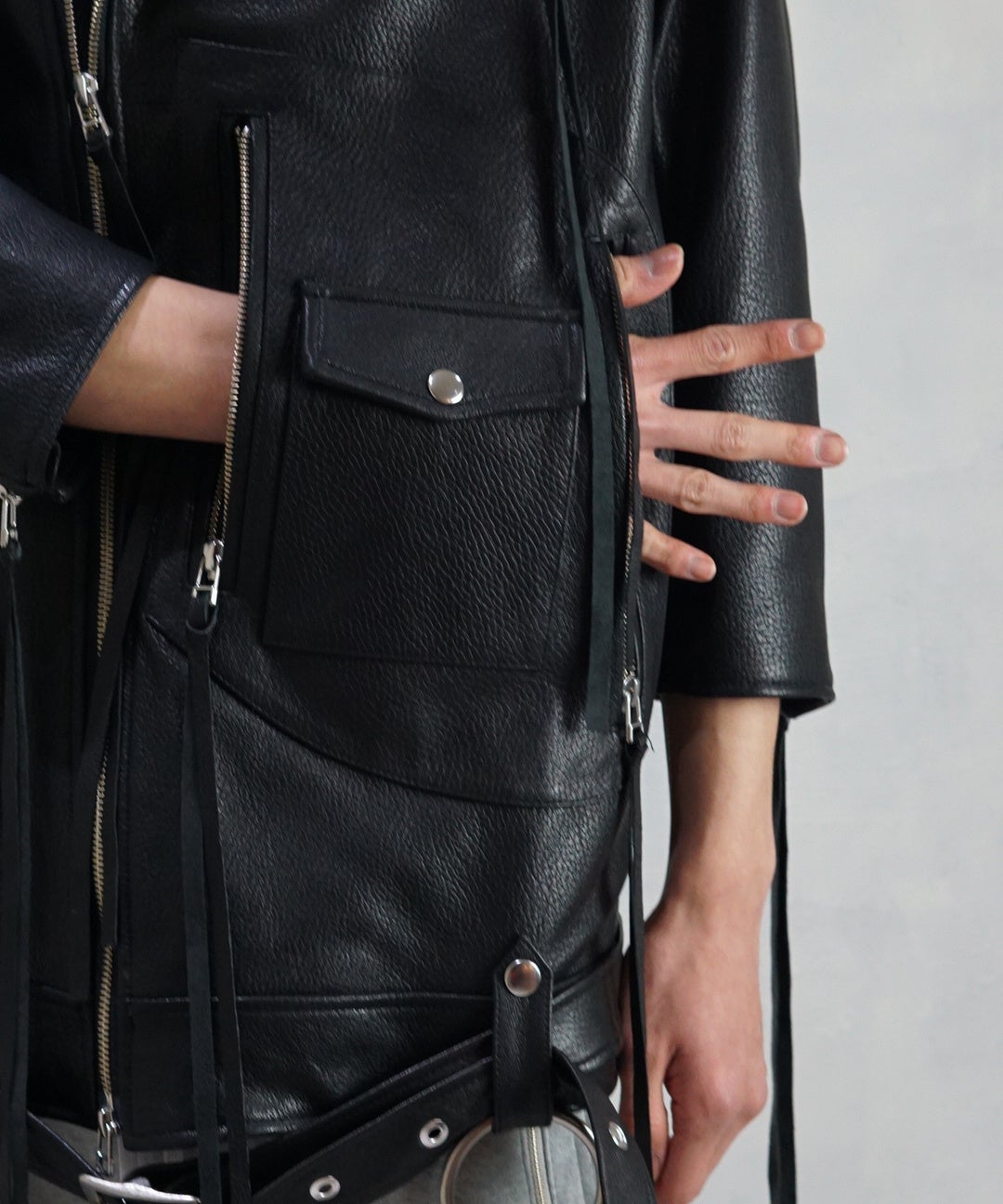 ウエスタンヨークを施した肩と背面に加え、フリンジのようになびくレザーコードが結びつけられたジップも印象的です。