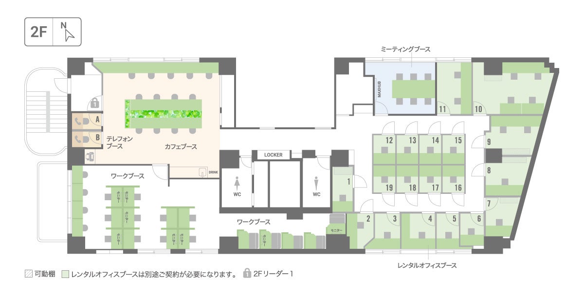 設備:Wi-Fi、フリードリンク、無料プリンター、ロッカー、ポスト、登記可、会議室、WEB会議用個室
