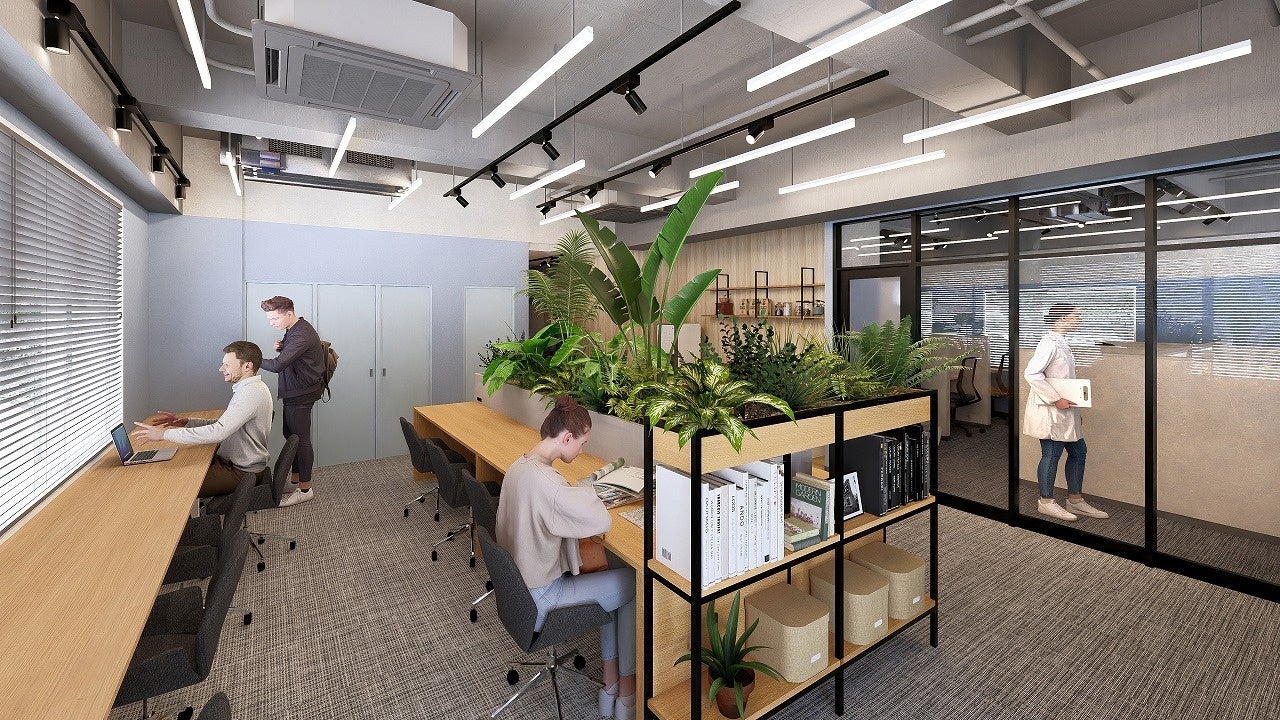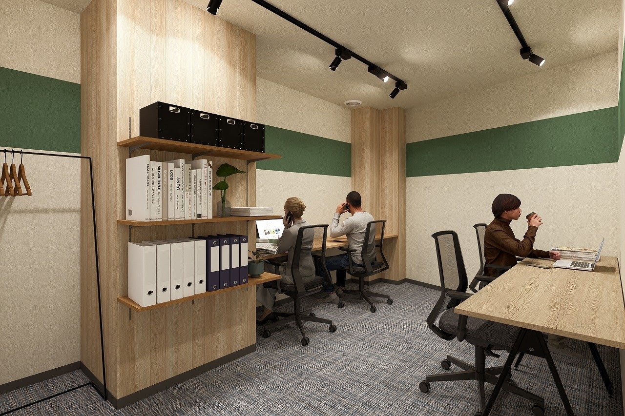 当施設は、2Fにコワーキングスペース・レンタルオフィス、3・4Fは事務所向けの約30㎡前後の広さがあり、大型モニター搭載の会議室や倉庫が備わったセットアップオフィスを展開します。ソロワーカーや自習ユーザーの他に、支店やサテライトオフィス用途の企業まで幅広いニーズに応えられるワークスポットを目指します。