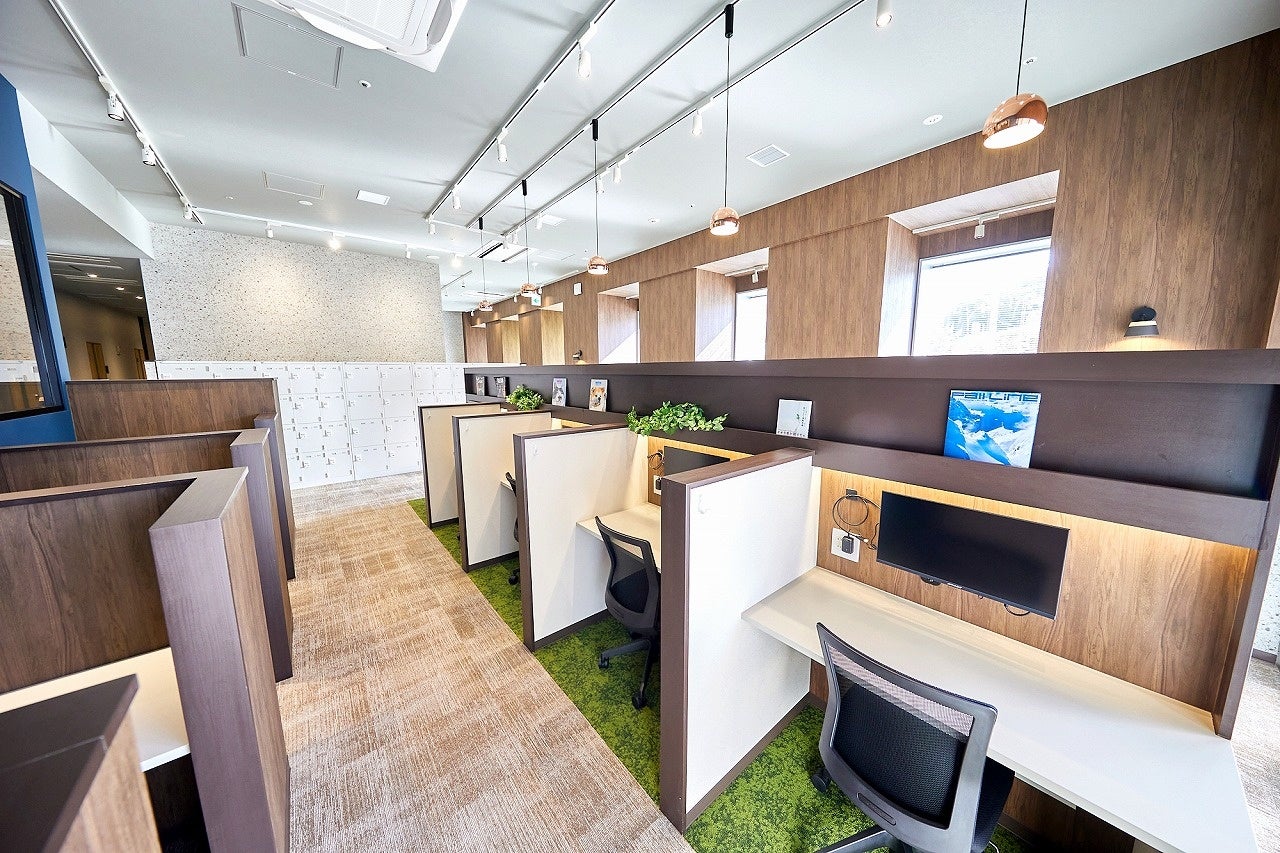 コワーキングスペースは、間仕切りとモニターのあるワークブースとWEB会議と食事ができるカフェブースにゾーニングされ、快適な空間を提供します。