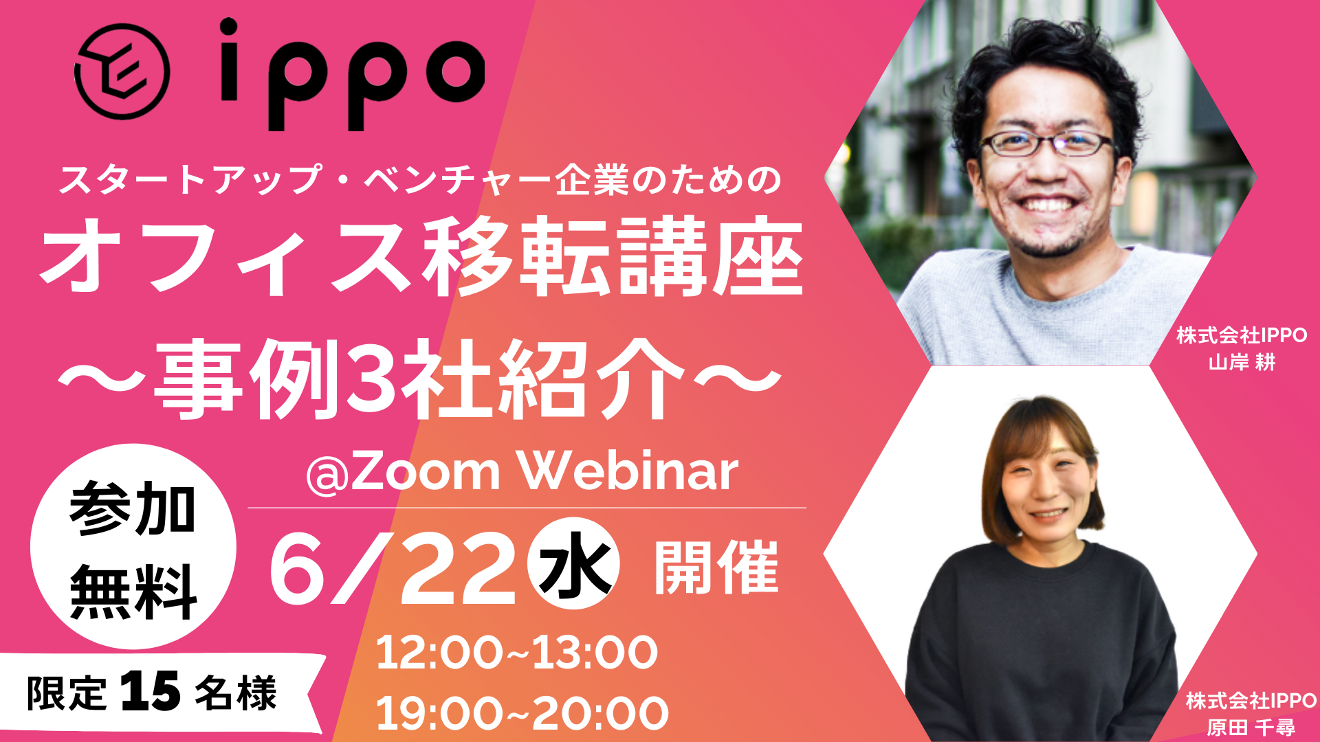 スタートアップ・ベンチャー企業に特化したオフィス仲介業務と不動産サービスを展開する株式会社IPPO(東京都渋谷区 代表取締役社長:関口秀人 以下IPPO)は、2022年6月22日(水)に『スタートアップ&ベンチャー企業のためのオフィス移転講座』としてオンラインセミナーを開催いたします。