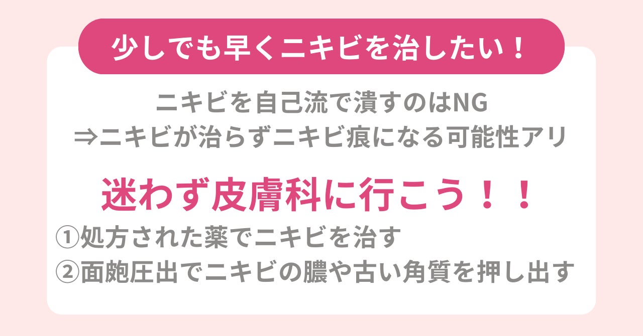さらに、皮膚科では二キビの皮脂や膿を押し出す「面皰圧出」という治療をしてもらえることがあります。