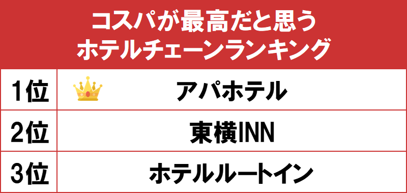 gooランキング(グーランキング)は、世の中のあらゆる「こと・もの」をランキング化する国内最大級のランキング情報サイトです。今回は、全国展開しているホテルチェーンをテーマに、最もコスパが良いのはどのチェーンなのかについて調査・ランキング化しました。