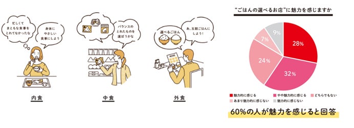 健康意識の高まりから、栄養バランスを考えた食事を自分で選ぶ傾向にあり、「ごはんの選べるお店に魅力を感じますか?」という問いに対して半数以上の60%もの人が”魅力を感じる”と回答しています。※1
