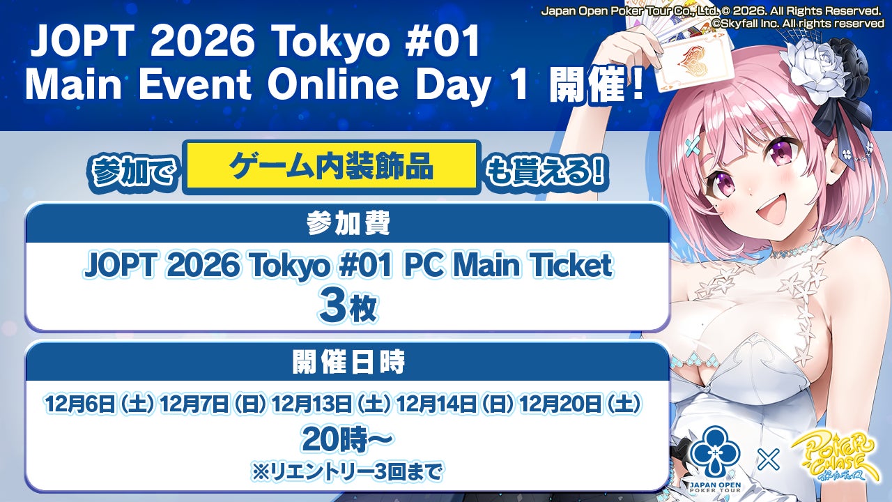 株式会社Skyfall(東京都港区 代表取締役社長:長谷川 智一、以下Skyfall)が運営するバトロワ式オンラインポーカーゲーム『ポーカーチェイス』は、ジャパンオープンポーカーツアー株式会社(東京都新宿区、代表: 亀井 翼、以下ジャパンオープンポーカーツアー)が開催する国内最大規模のポーカーイベント「JOPT 2026 Tokyo #01」にて、2025年11月20日(木) ~ 12月20日(土)の期間に、公式サテライト(予選)とJOPT 2026 Tokyo #01 Main Event Online Day 1(本選)を開催することが決定しました。