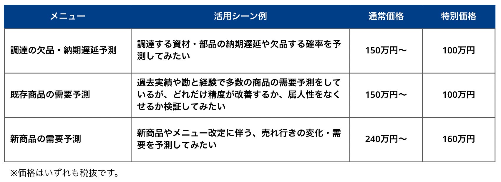 ※特別価格でのご提供は、分析用の過去実績データを弊社指定のフォームで共有いただくことが条件となります。