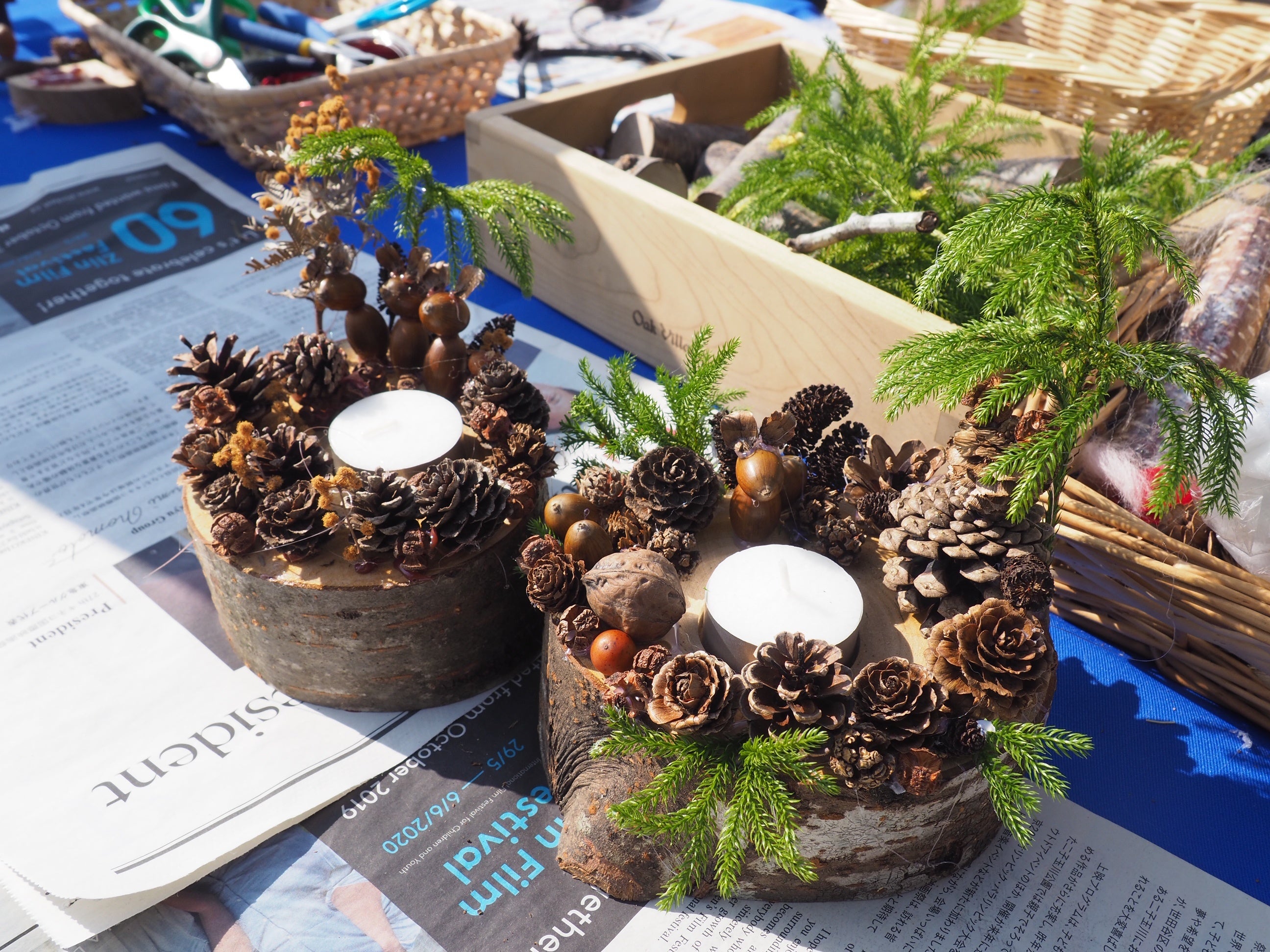間伐材の小さな切株の上に、飛騨の森で集めた木の実をデコレーションして製作。