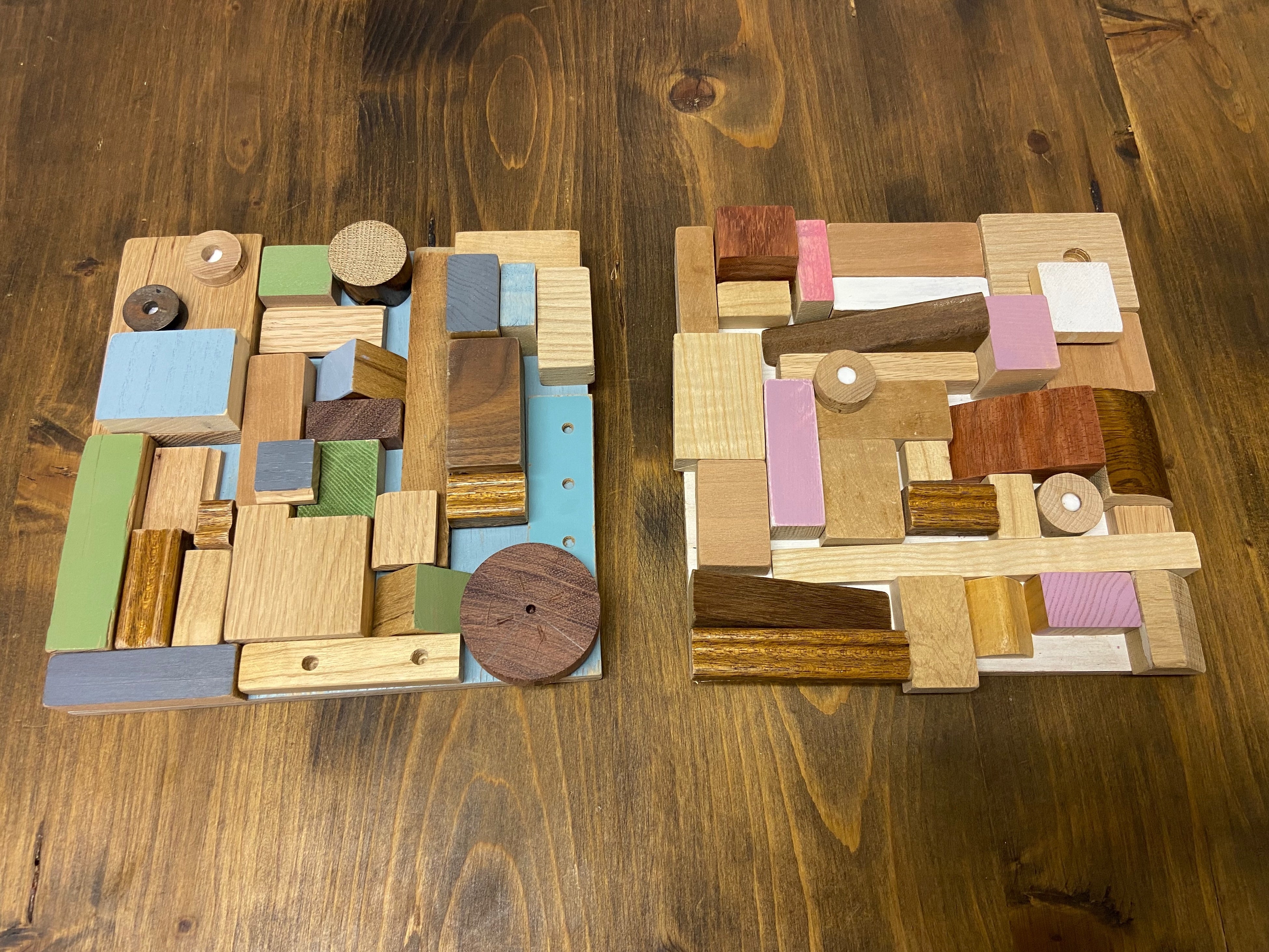 不要になった家具の木片を使ったモザイク状のアートパネル作りを体験できます。