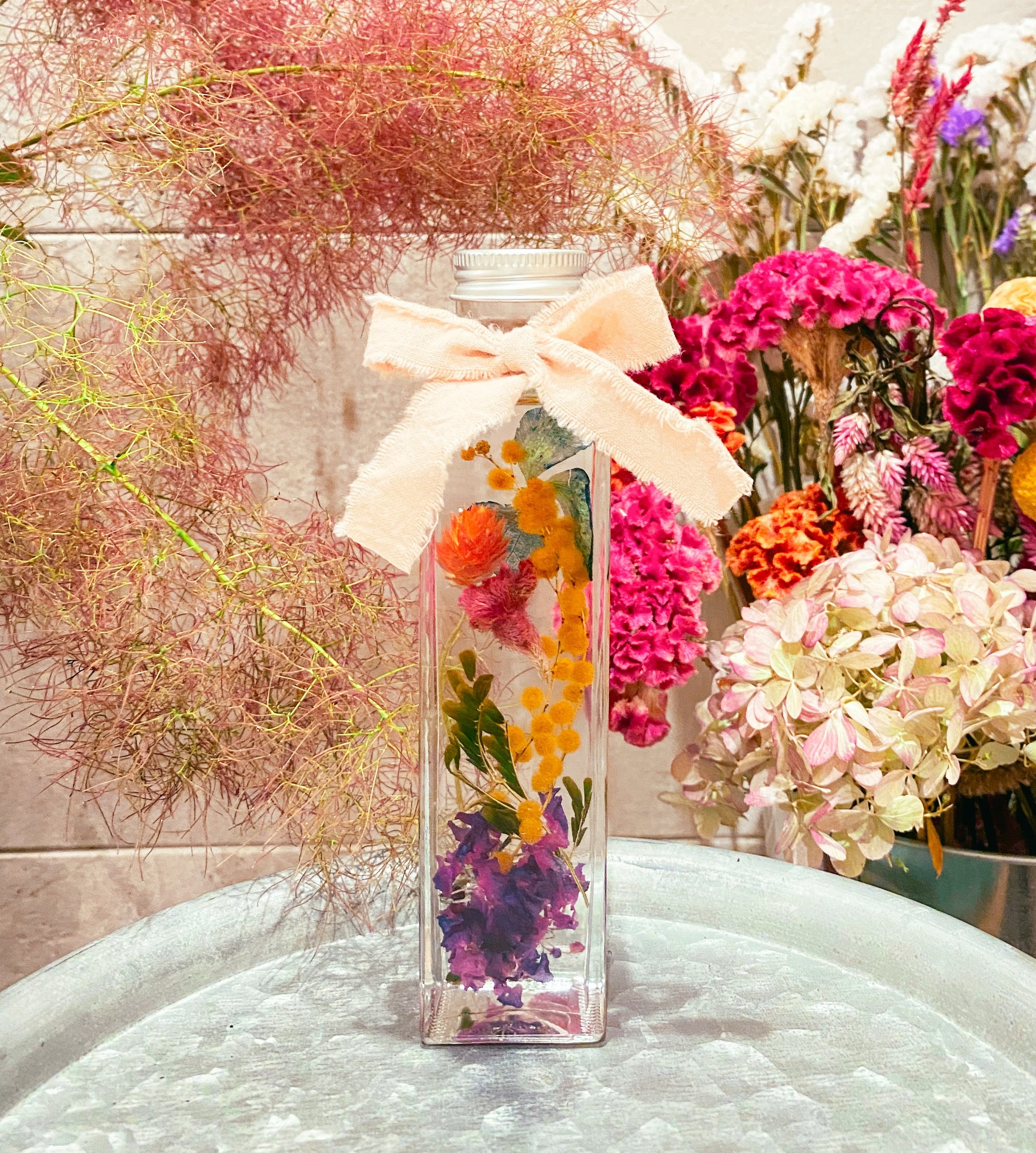 ロスフラワー(まだ綺麗なのに販売できず廃棄される花)を使用したオリジナルのハーバリウム作りを体験できます。