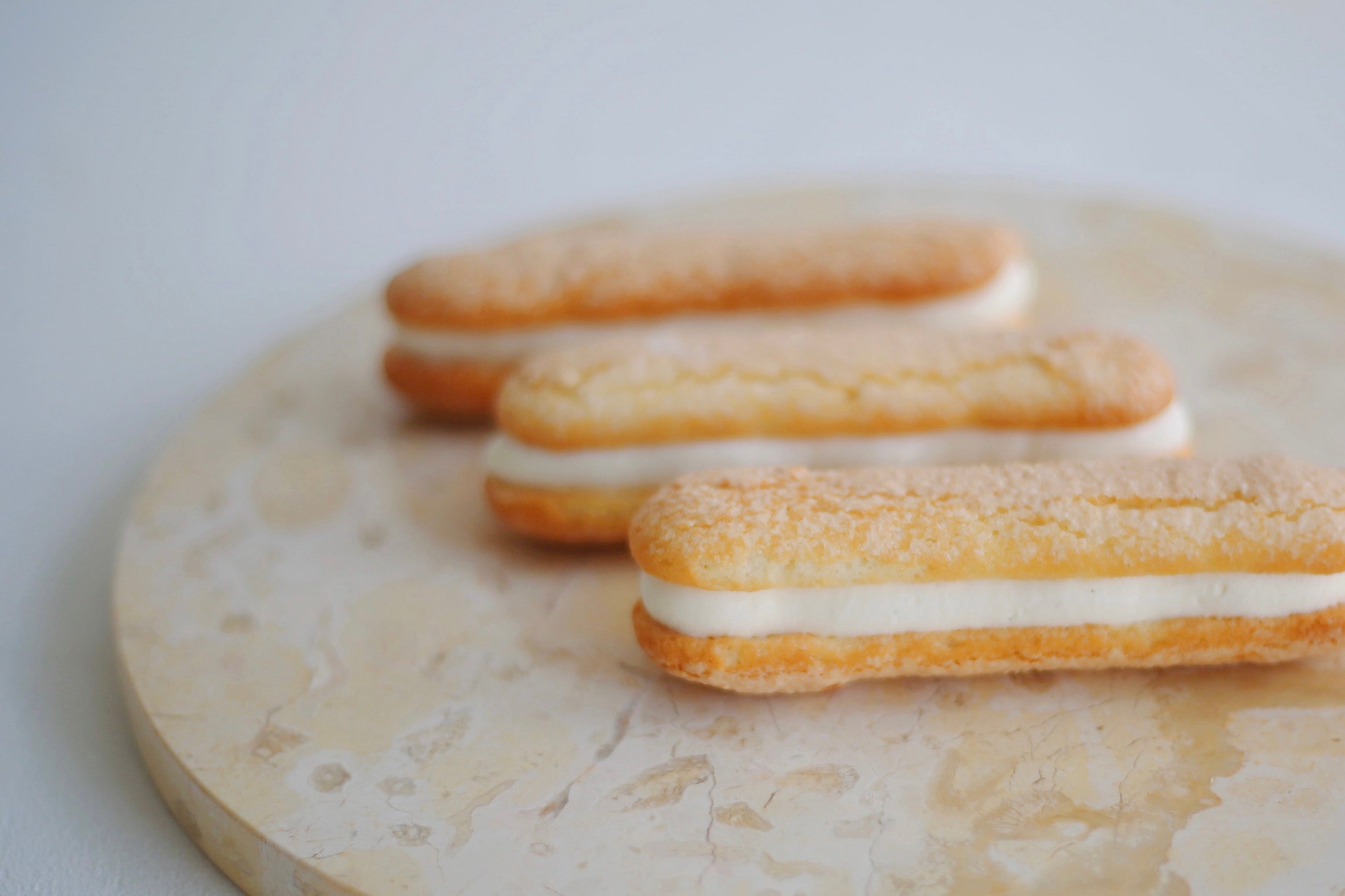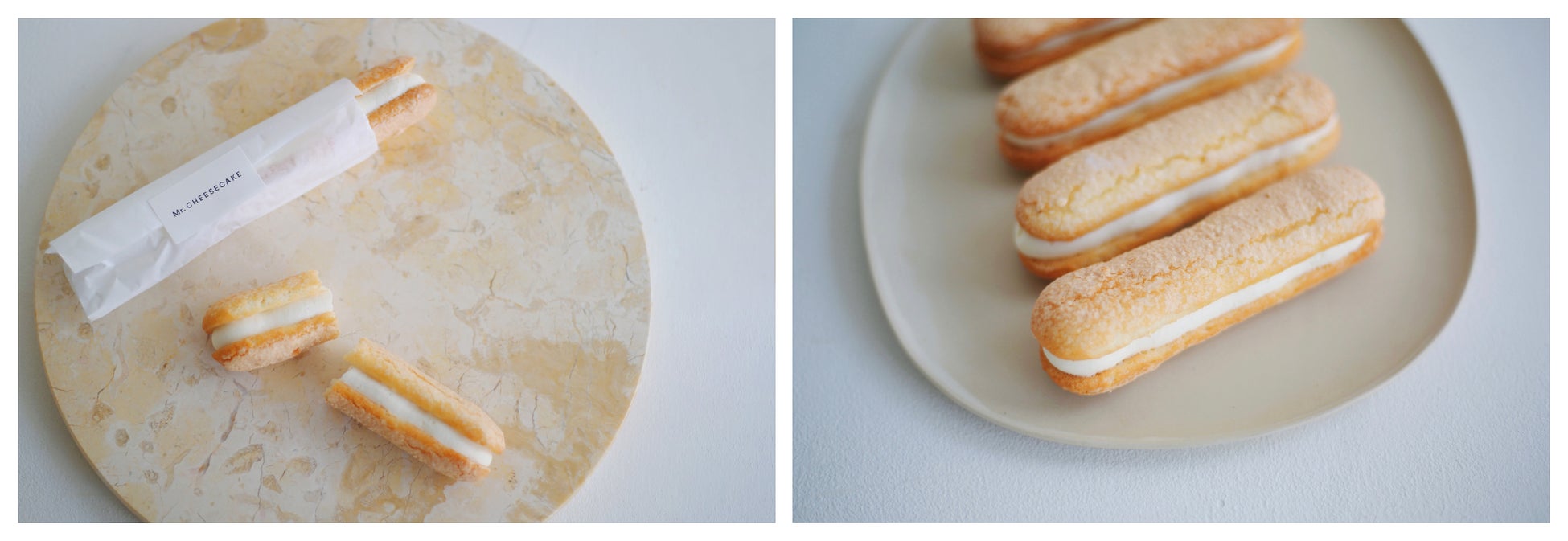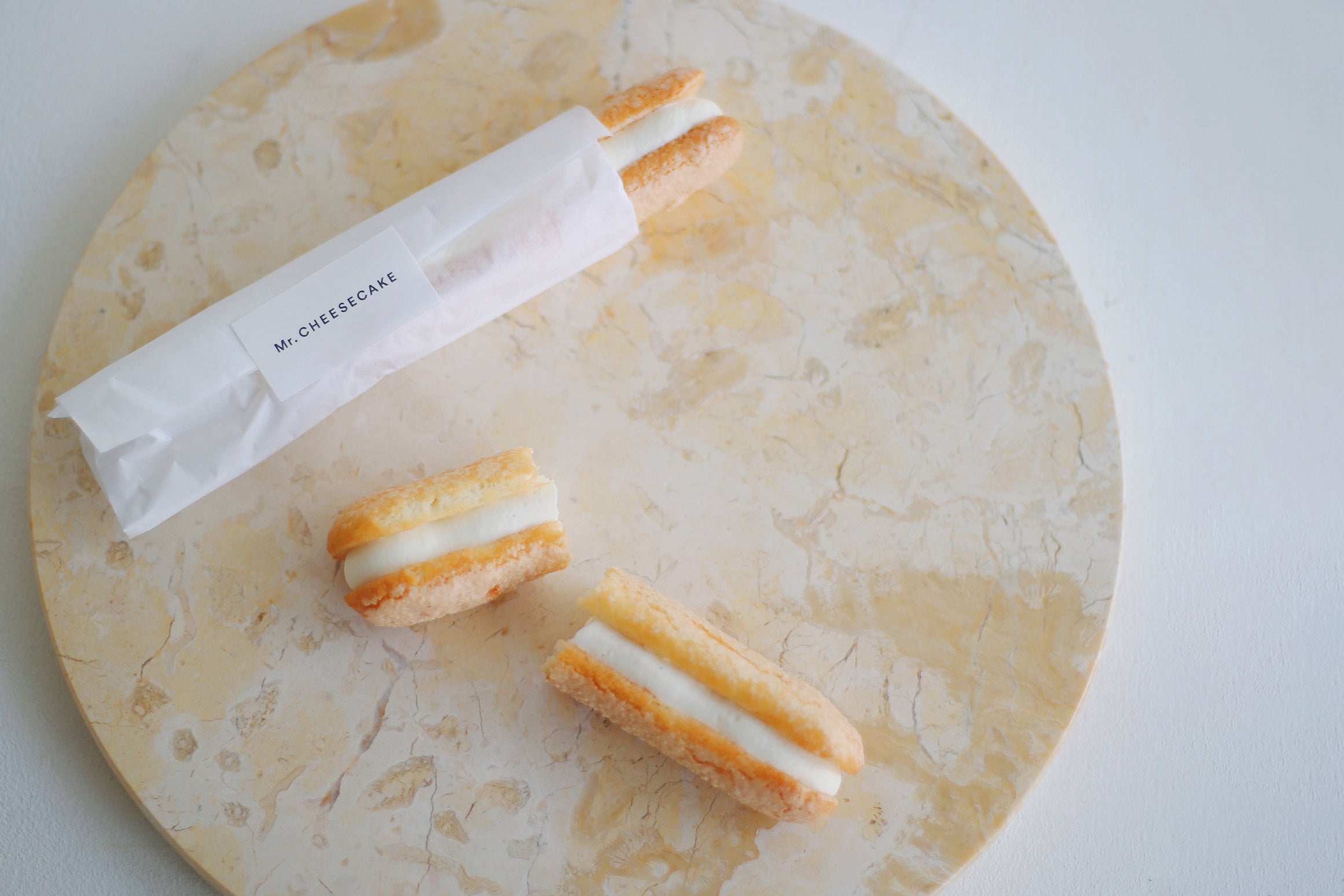 バニラ、レモン、トンカ豆を組み合わせたクリームを、ふわっと軽やかなダックワーズ生地にたっぷりと挟んだダックワーズサンド。Mr. CHEESECAKEのシグネチャーフレーバーを再現したレアチーズケーキのような甘く爽やかなクリームと、旨みのあるダックワーズ生地が重なる心地よい味わいをお楽しみください。