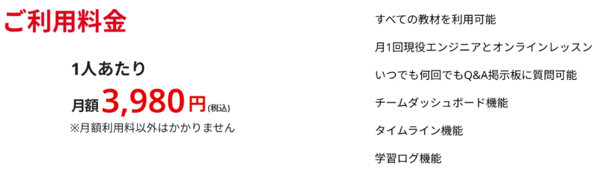 マンツーマン式のスクールで学習するには「金銭的余裕がない」という方や、まずは「プログラミングに触れてみたい」という初学者の方、またスキルアップのために「プロに相談したい」という中級者の方などにも気軽にご利用いただけるよう、低価格でありながら、実践的かつ質の高い学習ができる環境を詰め込んだ、日本最安級のサブスクリプション型サービスです。