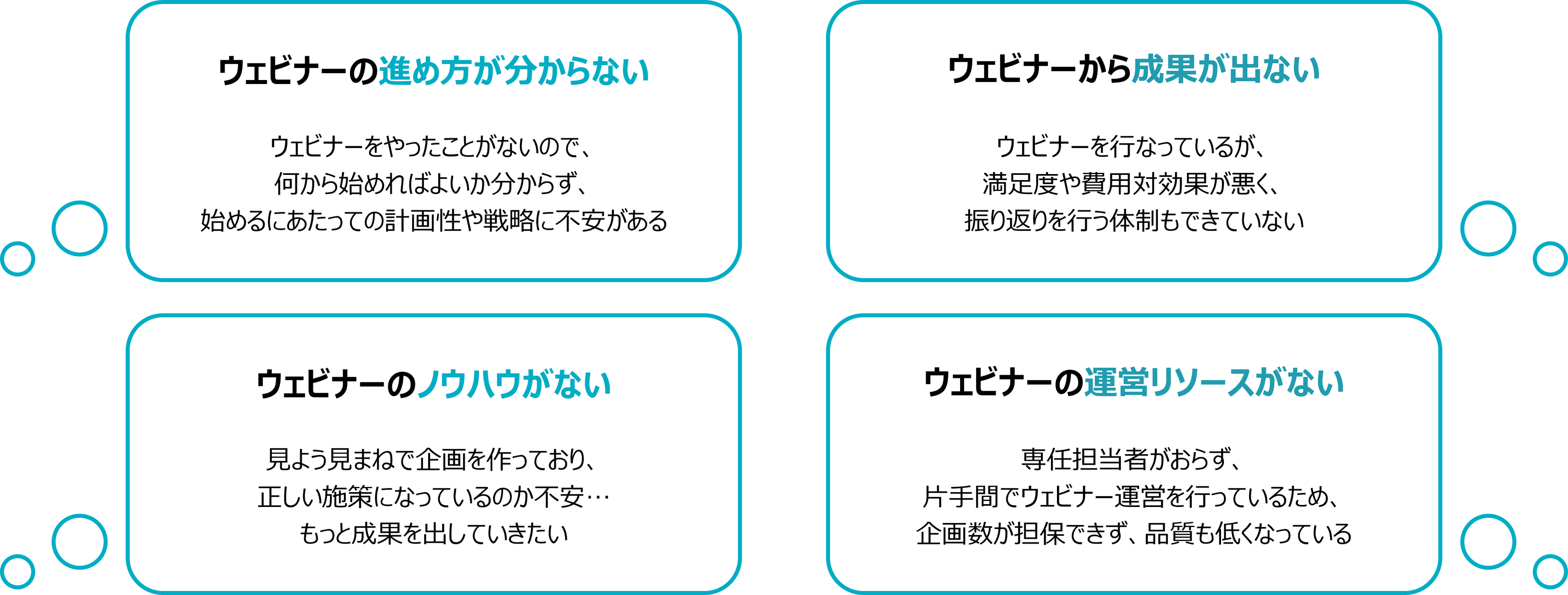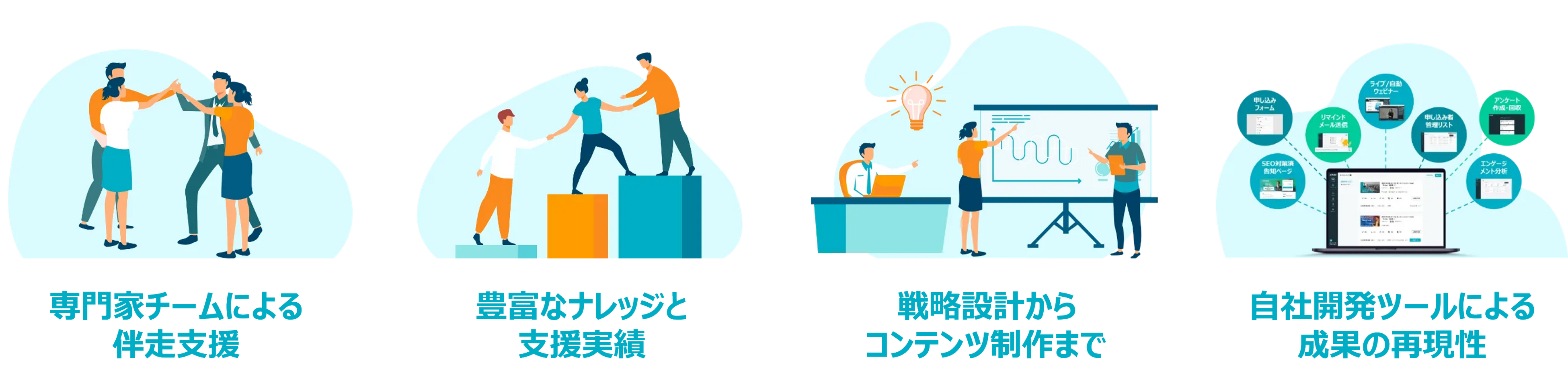 豊富なナレッジと支援実績 | 累計100社以上のBtoB企業様の支援を通して蓄積された、ウェビナーマーケティングに関する豊富な事例やナレッジを保有しております。 |