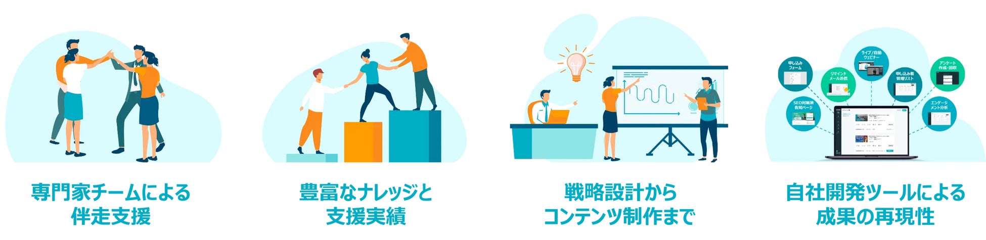 戦略設計からコンテンツ制作まで | 貴社のビジネスモデルに基づいて、ウェビナーマーケティングにおける戦略設計から計画策定、ウェビナーコンテンツの制作までをトータルで支援いたします。 |