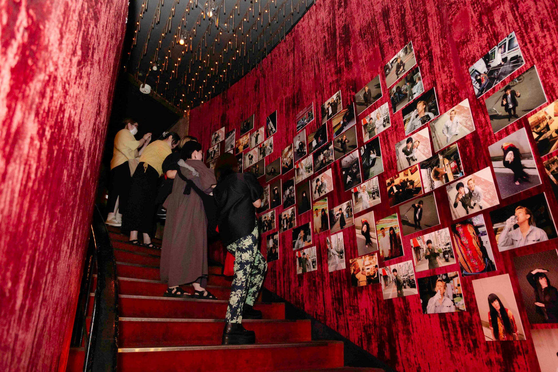 急遽18時半に開場時間が早まり受付を済ませると、会場へと続く階段のサイドには、金属バットと黒帯の写真がずらり。奥へ進むと、演者たちのパネルと予告メイキング動画で黒帯が着用していた作業着がディスプレイされ「もう最高やん!」と黄色い声を上げながら記念撮影する人も。