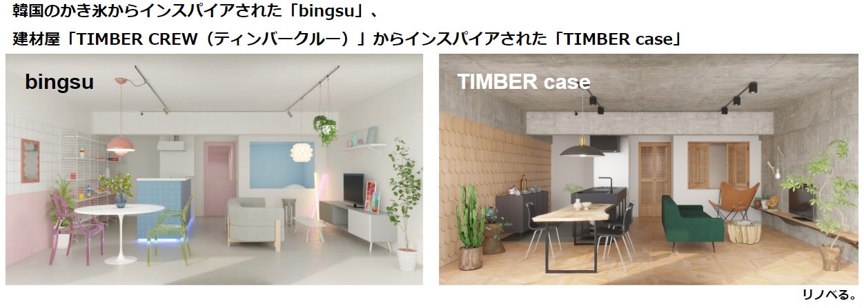 「sugata」は、現在67のテイストがあり、今年も15以上のテイストを発表しています。「sugata」のユーザーデータの分析や、「リノベる。」の営業や設計担当へのヒアリング、様々なトレンド分析や情報収集などから、定期的に新たなテイストを生み出しています。例えば韓国のかき氷「ピンス」からインスパイアされた「bingsu」は、カラフルで個性的なインテリアが似合う、SNSに写真を投稿したくなるようなテイストです。ネオンライトを使って韓国カフェのようなお部屋に仕上げています。また、木材を確かな技術とセンスでカタチにする建材屋「TIMBER CREW(ティンバークルー)」が一部の建材をオリジナルで製作し、それを実際に利用したテイストとして、リノベるがコンセプトづくりから行いました。床のパーケット、キッチンの下見貼の壁、TV台、洗面所の床などがオリジナルの建材で、木の可能性が感じられる空間となっています。