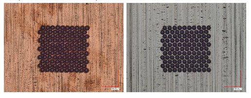 当社フェムト秒レーザー加工機を用いた銅箔(写真左)、アルミ箔(写真右)への精密穴あけ加工事例 穴径 / 配列ピッチ:0.025 mm / 0.03 mm (千鳥配列)