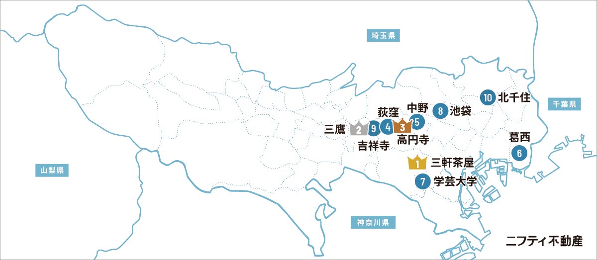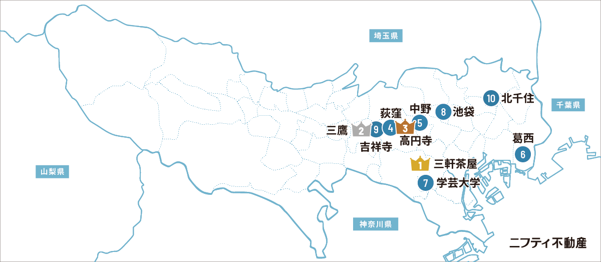 前回6位の「三鷹」が2位へと浮上。この春新生活を迎え、進学や就職、転勤などで引越しを検討したニフティ不動産ユーザーの関心を集めたようです。三鷹駅はJR中央・総武線と東京メトロ東西線の始発駅で、中央線中央特快も停車し、日々の通勤・通学に便利。「文化の街」としても知られ文豪の記念館なども多く、井の頭恩賜公園内には「三鷹の森ジブリ美術館」もあります。ファミリーや単身といった世帯を問わず暮らしやすく、落ち着いた生活環境が手に入るエリアとして、今後も人気は続きそうです。