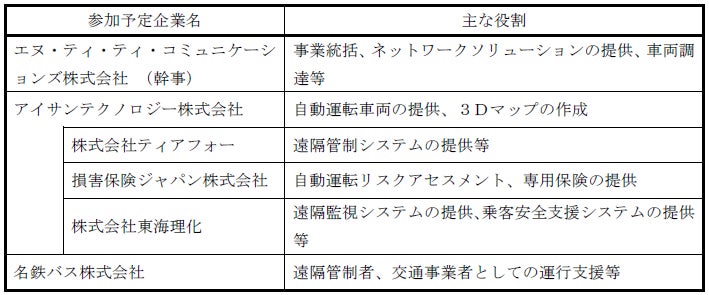 当社は、株式会社ティアフォー(本社:愛知県名古屋市、代表取締役社長:加藤 真平)、損害保険ジャパン株式会社(本社:東京都新宿区、代表取締役社長:石川 耕治)、および、株式会社東海理化(本社:愛知県丹羽郡大口町、代表取締役社長:二之夕 裕美)の協力会社とともに参画します。